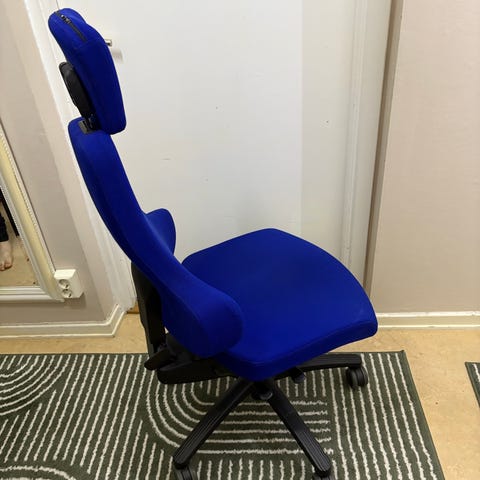 Kontorsstol från Nevo. Använd i 3-4 månader men eftersom kontoret ska bort säljes även stolen. Ett par stygn har gått upp på tygdelen där man vilar vänster arm, antingen så kan man ta bort tygdelen helt eller sy ihop. Det har inte stört mig så det har fått vara.