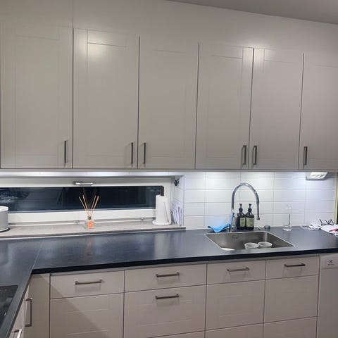 Köksskåp och lådfronter i vit klassisk stil. Överskåp med profilerade luckor, ett vitrinskåp med krysspröjs samt underskåp med lådfronter och metallhandtag. Jag monterar ner köket och du hämtar! Det blir aktuellt med nedmontering i mars enligt överenskommelse.