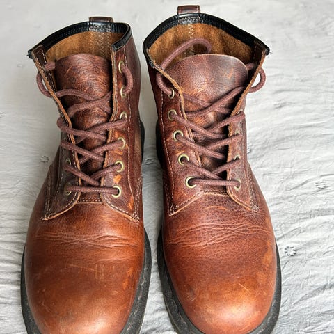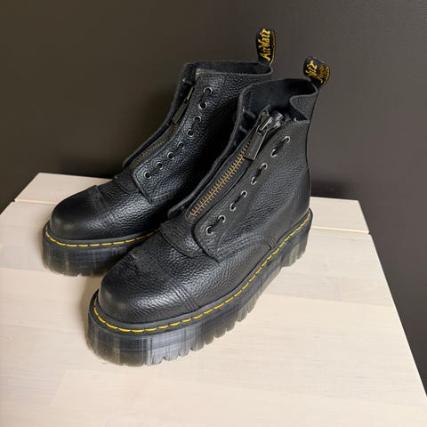 Dr. Martens skor i svart färg i storlek 43. Modellen har kraftig sula med gul söm, vävd ovandel med spänne över foten och hälflik med logotyp. Skorna är låga och passar för vardagsbruk eller som en del av en mer alternativ stil.