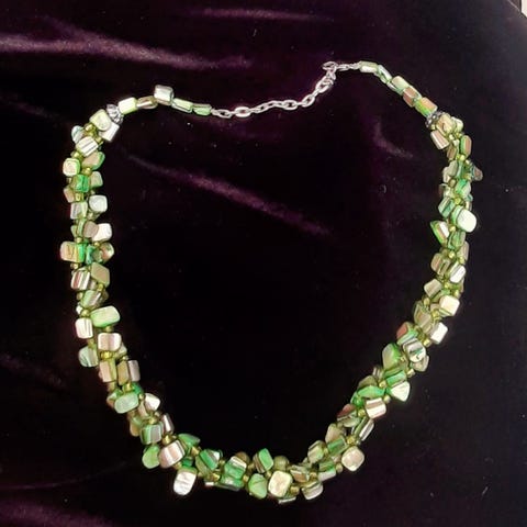 Vintage halsband av malakit chips. Vikt 57 gr. Längd 45cm.