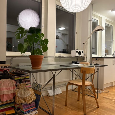 Skrivbord med glasbordsskiva och hopfällbar trästol