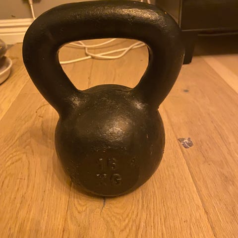 Träningsutrustning bestående av olika fria vikter och tillbehör. Setet inkluderar kort hantelstång med skruvlås och gummigrepp, rak eller lätt böjd skivstång, flera viktskivor i olika vikter samt kettlebells 12 och 6 kg. På bilderna syns även ett par träningshandskar i storlek S. Utrustningen är avsedd för styrketräning i hemmet, till exempel övningar för armar, axlar, rygg och ben med hjälp av hantlar, skivstång och kettlebells.