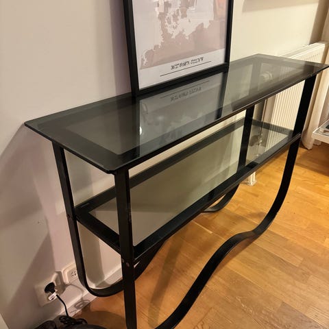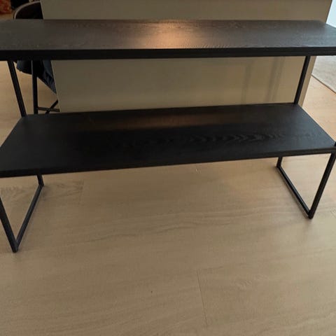 Derby är ett avlastningsbord i betsat askfaner med en tydlig trätextur. Underredet är i lackerad metall.