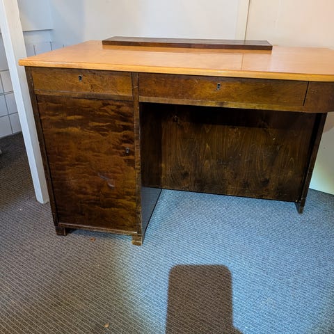 Ett superfint skrivbord från tidigt 1900-tal. Skivan skulle må bra av lite kärlek, alla lådor funkar att dra ut.