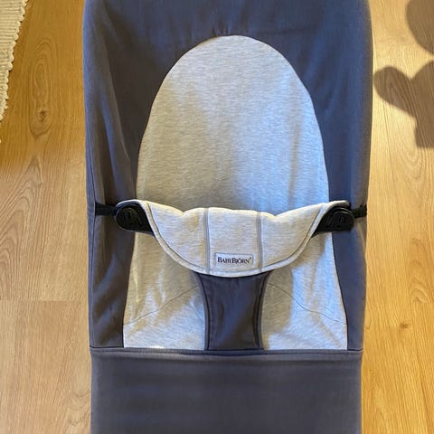 Babybjörn barnstol/babysitter i grå textil med svart stativ. Medföljande lekbåge med färgglada figurer är fäst framtill.