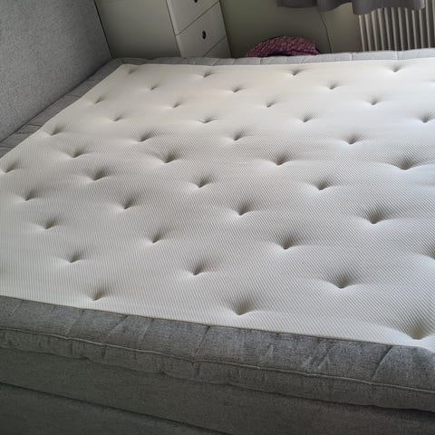 Den översta madrass har tvättats och fått lite missfärgning vid torkning. Har använts med ytterligare 180 x200 madrass från Jysk.