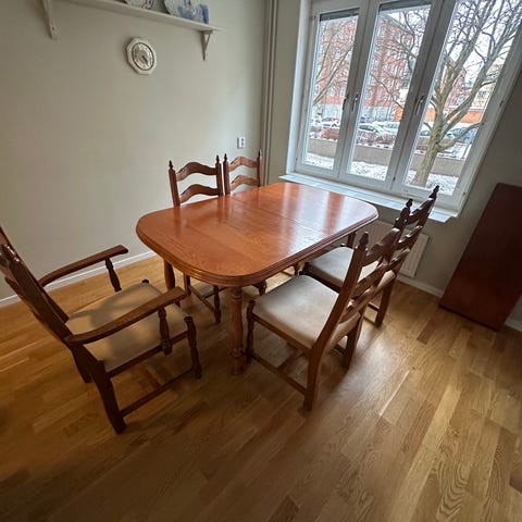 Bordet är sparsamt använt men har tyvärr en transportskada som blev när vi flyttade, se bild.