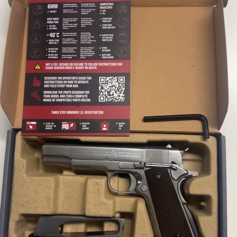 I utmärkt skick. 3 magasin totalt som verkar hålla tätt vid test, ingen garanti lämnas för detta. Hop-up och blow back för bästa känsla. Kvalitetsvapen som använts sparsamt.