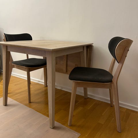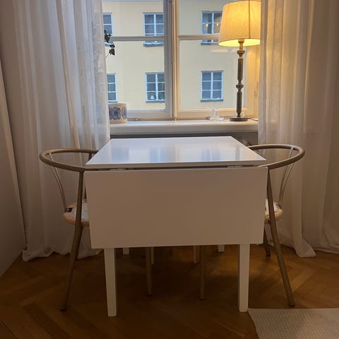 Matbord från Stalands köpt 2022 i vitpigmenterad ek. Nypris:6000kr. Klaff som kan fällas upp så längden på bordet blir 164cm.