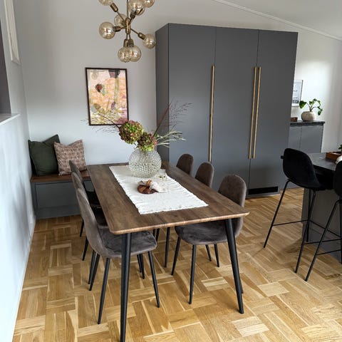 Bordet är 180 cm långt och 90 cm brett, med plats för 6–8 personer. Perfekt för både familjemiddagar och gäster. Stabil konstruktion med varm träskiva och vitmålad stomme som passar i de flesta hem.