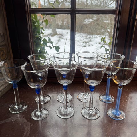 Dessa är Pralin cocktailglas i turkosfärgad glas, designade av Pia Eldin-Lindsten för IKEA runt 2005. De är populära samlarobjekt.
