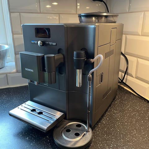Siemens helautomatisk espressomaskin i svart utförande. Maskinen har inbyggd kvarn för hela bönor och frontpanel med display och knappar för val av olika kaffedrycker, till exempel espresso. Utrustad med dubbla kaffemunstycken samt separat ångrör för skumning av mjölk. Droppbricka och koppställ i metall framtill. Maskinen är fristående och placeras på bänk. Passar för bryggning av kaffe- och espressodrycker i hem- eller kontorsmiljö.