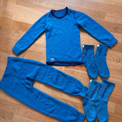 Tröja och långkalsonger, för skidåkning eller vinteraktiviteter.
