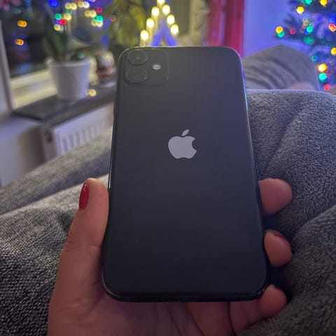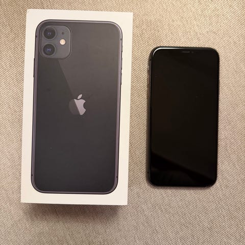 Apple iPhone 11 mobiltelefon med 64 GB intern lagring. Modellen har pekskärm och stöd för SIM-kort, som visas på bilderna där PIN-kod efterfrågas. Telefonen lämpar sig för vanlig användning som samtal, meddelanden, appar och surf. Lagringsutrymmet på 64 GB ger plats för appar, bilder, videor och andra filer beroende på användarens behov.