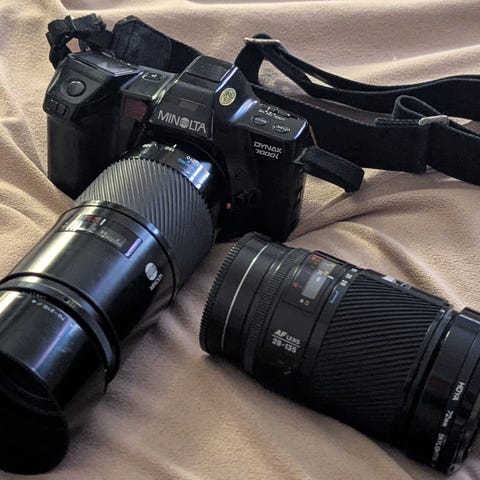 Minolta kamera med utbytbart objektiv och flera tillbehör. På bilderna syns kamerahus med rem, ett zoomobjektiv, blixt/enhet som monteras på kameran samt flera motljusskydd och lock.