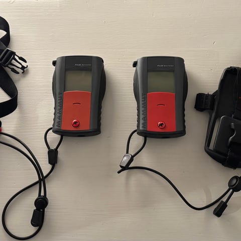 Ortovox Badger 2.5 lavinutrustning i blå färg. Setet inkluderar en lavinspade med skaft, en sond i fodral märkt Ortovox samt en lavinsändare/mottagare i fodral. Utrustningen är avsedd för användning vid topptur, offpiståkning och annan vinteraktivitet i lavinterräng, där spade, sond och transceiver används tillsammans för lokalisering och framschaktning vid en lavinsituation.