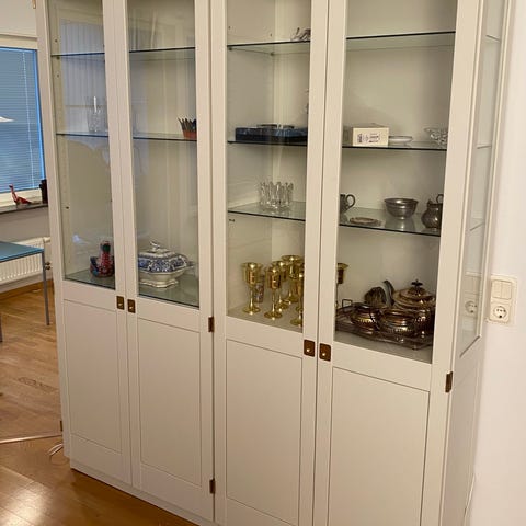 Charmigt vitrinskåp i massiv furu. Överdel med vitrindel och glasdörrar samt öppna hyllor på sidan. Underdel med två dörrar och förvaringsutrymme samt lådor upptill. Passar för förvaring av porslin, glas, kökstillbehör eller annan förvaring i exempelvis kök, matsal eller vardagsrum.