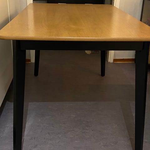 Stilrent bord från JYSK med träskiva i ek-look och svarta metallben.