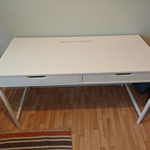 Bord från Jysk i fint skick med två lådor, vitt högglans. Passar både som sminkbord eller skrivbord.
