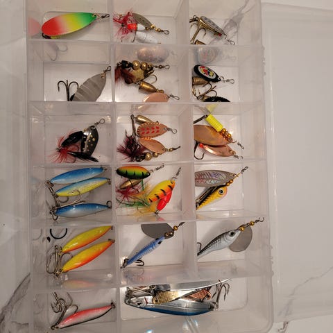 Set med två fiskerullar och en wobbler. Den ena rullen är en mindre multirulle i metall med vev och lina monterad. Den andra rullen är en haspelrulle i metall och plast, grön och vit, även den med lina monterad. Medföljer gör också ett hårdbete/wobbler i förpackning. Utrustningen är avsedd för sportfiske och kan användas tillsammans med passande fiskespö för olika typer av fiske.