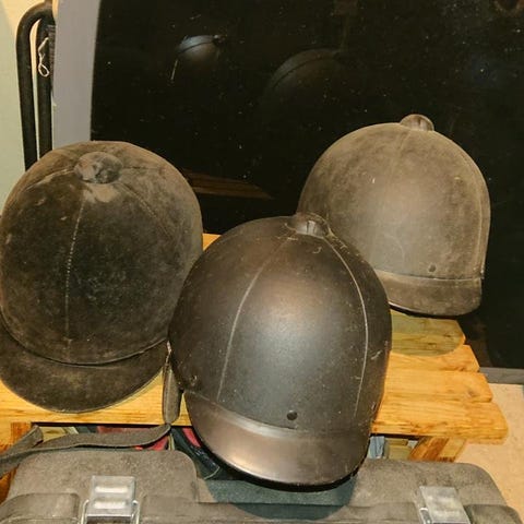 Strl 34 på stövlarna och hjälm strl S. Allt från hööks. 100 kr st.