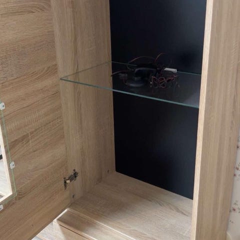 En stor fin tv bänk med vitrinskåp med blå belysning i. Finns ett "smalt" skåp till som inte är med på bilden, säljer för de är för stort hos mig..