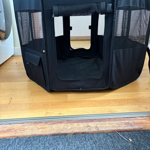 Hundhage i vikbar modell, lämplig för mindre hundar. Hagens sidor är i ett grått material med fönsteröppningar för insyn och ventilation. Passar för användning utomhus på gräsmatta eller liknande underlag. Ger en avgränsad yta där hunden kan vistas under uppsikt.
