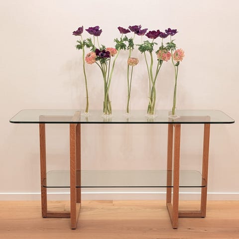 Svart stålunderrede. Två hyllplan av glas.