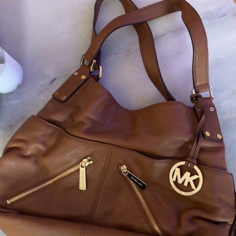 Metall detaljer och dragkedja i guldfärgad metall samt rund MK-logga på sidan.
