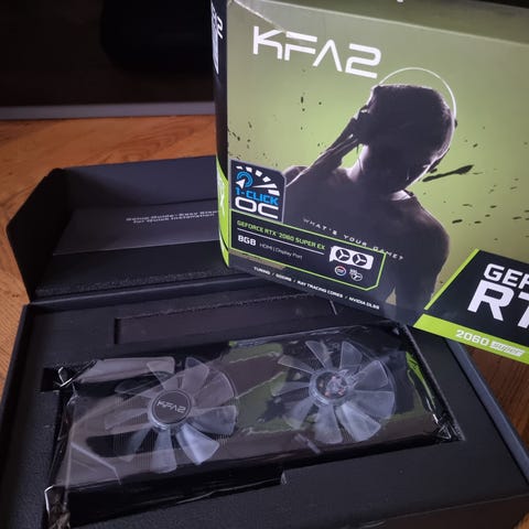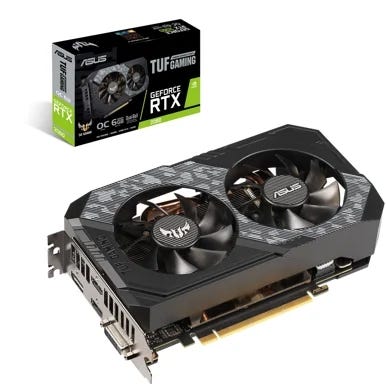 Asus Dual GeForce RTX 2060 OC 6GB grafikkort. Modellen har dubbla kylfläktar och använder PCIe-anslutning. Kortet är utrustat med flera bildskärmsutgångar, bland annat 2x DisplayPort, 2x HDMI och 1x DVI. En av de mest prisvärda grafikkorten idag.
