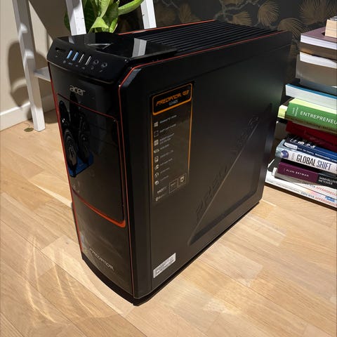 Acer stationär dator med Intel Core i5-processor (9:e generationen) i svart chassi. Datorn har HDMI-utgång och flera anslutningar på baksidan, inklusive nätverksport, ljudportar och extra expansionsplatser. Lämplig som stationär arbets- eller hemdator beroende på installerad hårdvara och programvara. Exakta specifikationer för internminne, lagring och grafikkort framgår inte av bilderna och kan kontrolleras i systeminformationen på datorn eller på etiketten på chassit.