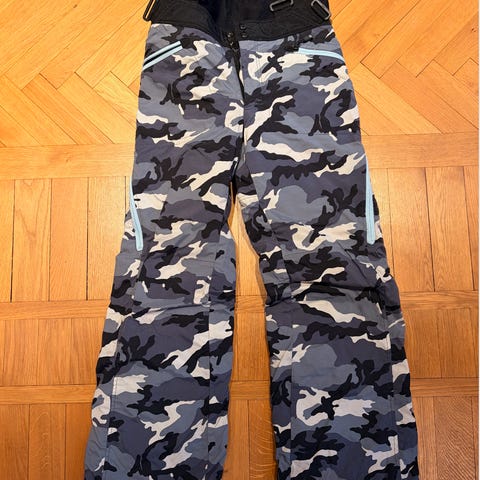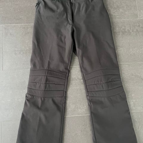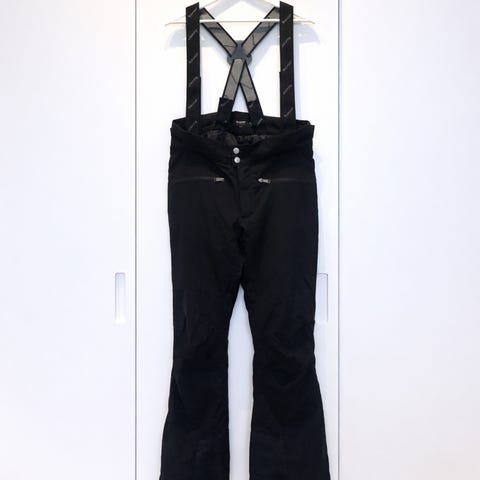 H&M Sport skidbyxor för dam i storlek EUR 38. Byxorna är svarta och har hängslen med text. Modellen är figurnära med förstärkningar vid knäna och dragkedja fram. Passar för skidåkning och andra vintersporter.