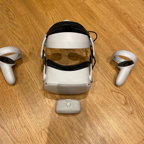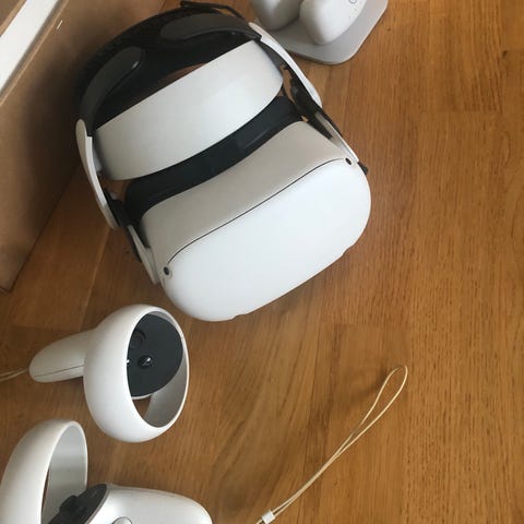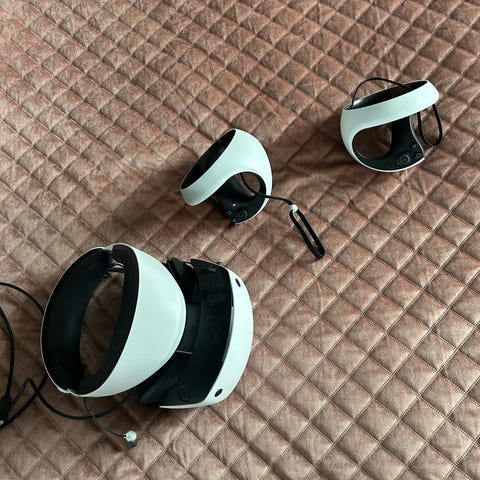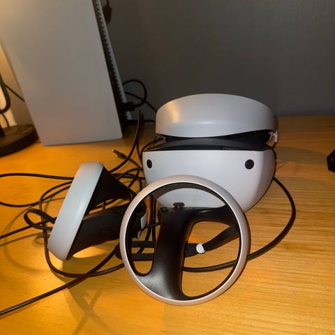 Sony Playstation VR (PSVR2) headset med tillhörande handkontroller och kamera. Headsetet är vitt och svart och ansluts med kabel. Två rörelsekontroller ingår med laddare, utformade för VR-användning med knappar och styrspakar. En separat kameraenhet med dubbla linser och kabel ingår för spårning av rörelser. Utrustningen är avsedd för användning tillsammans med Playstation 5 konsol för virtuell verklighet.