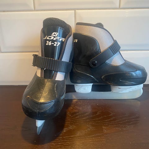 Barnskridskor i storlek 26. De har hårt ytterskal med justerbara spännen upptill och snörning framtill för att hålla foten på plats. Passar för barn som ska åka skridskor på isbana eller friluftsis.