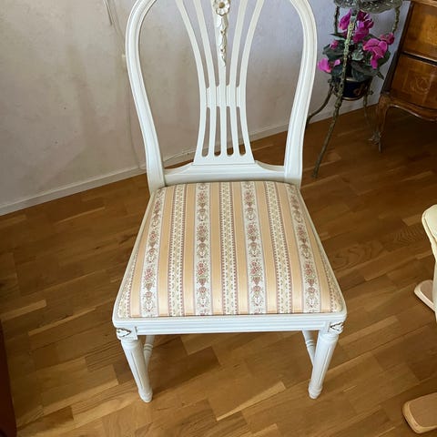 Finns slitage på stolar. Bord i gott skick som kan göras till långbord, två iläggsskivor finns till.