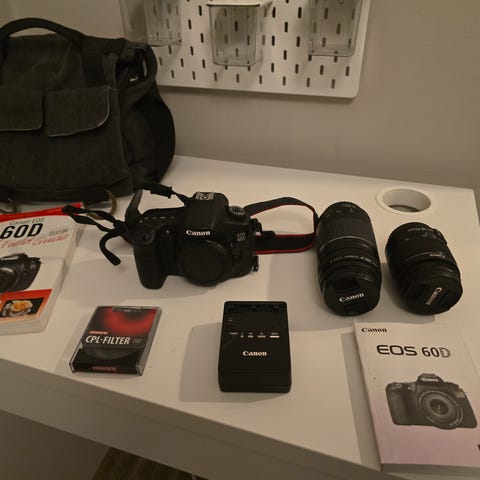 Canon EOS 60D digital systemkamera. Medföljer ett zoomobjektiv Canon EFS 18-135mm, ett batteri, laddare och bruksanvisning.