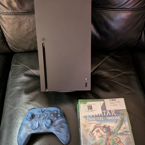 Microsoft Xbox Series X spelkonsol i svart utförande. Stationär konsol i vertikal design med ventilationsgaller på ovansidan och anslutningar på baksidan, inklusive HDMI och USB-portar. Passar för spel, streaming och annan underhållning i hemmet. Ingen extra utrustning eller tillbehör kan bekräftas utifrån informationen som finns här. Funkar som ny det är bara att starta logga in och börja spela.