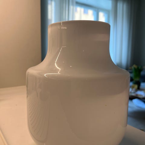 Stor vas i vitt glas, höjd 24 cm, bredd 25 cm.