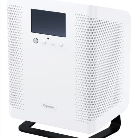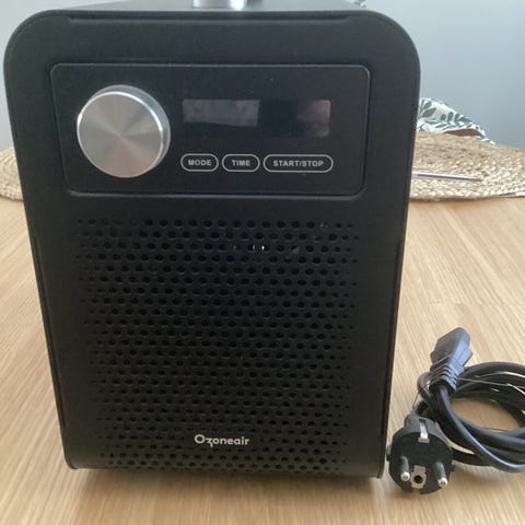 Ozoneair luftrenare i vit färg. Enheten står på fot och har genombrutna ventilationsgaller på sidorna. På framsidan finns display och knappar för styrning. Medföljande fjärrkontroll har flera knappar för att justera inställningar på avstånd. Lämplig för inomhusbruk för rening av luft i bostad eller liknande utrymmen.