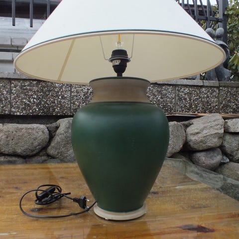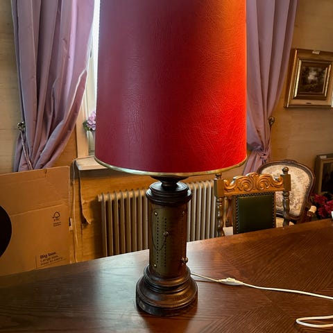 Snygg vintage art deco-inspirerad bordslampa från Bergboms Scanlight AB. Basen är i trä med intarsia, cremefärgad skärm med mindre defekter (liten fläck, ca 2 cm, på ena sidan som ev går att få bort, samt mindre ojämnheter upptill). Lampan är genomgången och hela sladden bytt, till en brun tvinnad textilsladd med jordad kontakt. Funkar som den ska.
