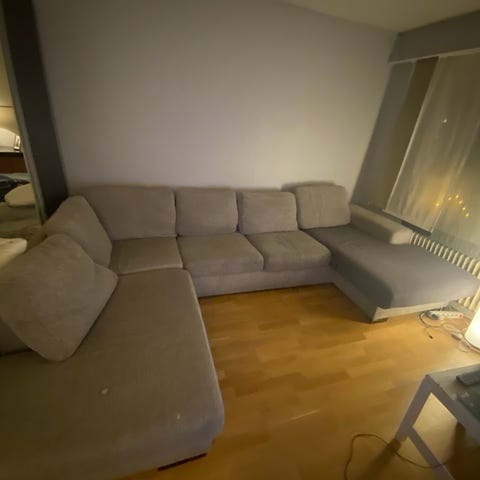 Vår Kiviksoffa ska nu bort. Det är två sits plus en schäslong. Soffan är fortfarande väldigt skön trots att den har en del år på nacken (2018). Alla kuddar följer med. På bilderna ser ni att en sömm har släppt på schäslong sittkudden (inget som stör funktionen eller komforten) samt på undersidan av schäslongkudden så har kardborren släppt lite.. Soffan är delad i två, tvåsits delen är en del och schäslongen är en del. De hakas i varandra enkelt.