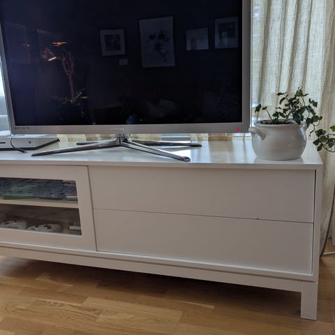Vit klassisk tv-bänk från Ikea med bra förvaringslådor.