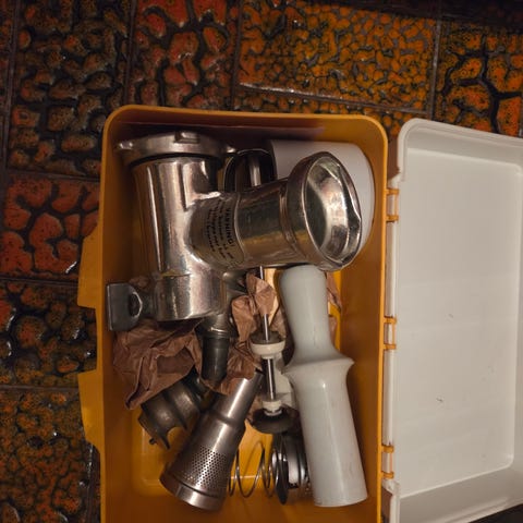 Electrolux köksassistent i beige utförande med rostfri skål och tillhörande lock. Maskinen har två reglage på fronten och är avsedd för blandning och knådning av deg samt annan matberedning. Till köksassistenten hör en köttkvarn med påmatningsskål och matarbrygga, samt extra hålskiva. Det följer även med tillbehör som degskrapa och visp-/degkroksarm. Bruksanvisning och originalkartong till köttkvarnen ingår enligt bilderna. Produkten är lämplig för bakning, malning av kött och allmän matberedning i hushållskök.