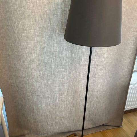 Golvlampa Skottorp / Skaftet från IKEA. Svart med grå/beige skärm. Du kan läsa mer här: https://www.ikea.com/se/sv/p/skottorp-skaftet-golvlampa-bage-ljusgra-s49385987/