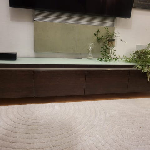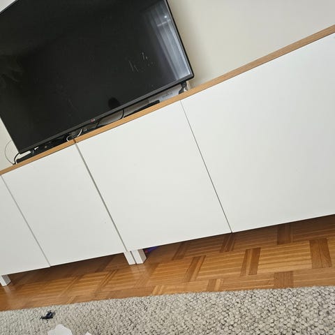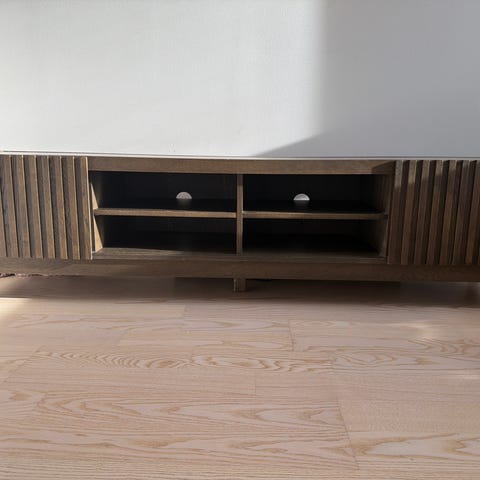 Stand is 120x42x48 cm. Has shelves and doors with handles. Few scratches on the top (shown in last 2 photos).