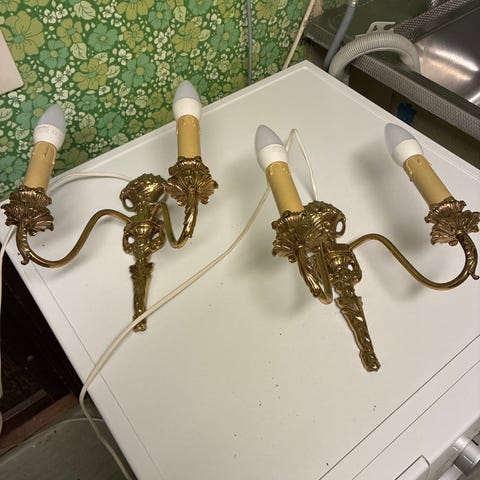 2stk vägglampor i mässing. Lamporna är utformade för montering på vägg och har en klassisk, cylindrisk form med rund väggplatta. De är utrustade med sladd och strömbrytare. Passar till exempel som läslampor vid säng eller som belysning vid spegel eller i hall. Ljuskällor ingår inte, utan väljs efter önskad ljusstyrka och sockeltyp som passar armaturen.