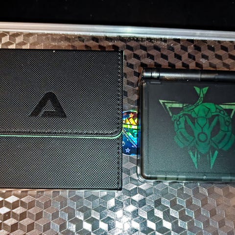 Gakken Trojan Horse LCD-handspel. Bärbart elektroniskt spel med LCD-skärm och inbyggda knappar för spelval (Game A och Game B), start/stopp samt klock-/alarmfunktion. Enheten har metallfärgad framsida med grön panel runt skärmen och grön baksida med batterilucka och utfällbart stöd. Drivs med batteri (typ enligt märkning på baksidan). Avsett som handhållet spel för en spelare.