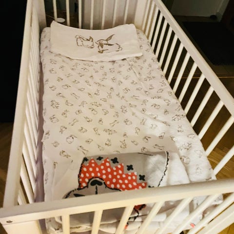 IKEA juniorsäng i vit färg med motiv av kaniner, ballonger, moln och stjärnor på huvud- och fotgavel. Sängen har skyddande sidoräcken längs långsidorna. Passar för barn som vuxit ur spjälsäng och behöver en lägre säng med begränsat fallutrymme. Madrass följer med om man vill ha! Är en Växasäng så den kan bli längre. Finns i Tanumshede