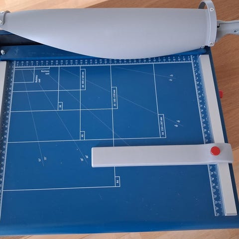 För frekvent användning på kontoret för att skära igenom papper (A4+), etiketter, film, foton, laminat, kort och kartong.
