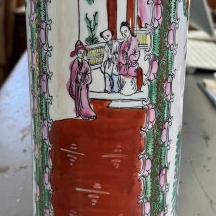 Tillverkat i porslin med handmålad dekor i järnrött. Blommotiv i centrum samt vågformad bård runt kanten. Skick: Föremålet har nagg, sprickor och gamla lagningar – se bilder för detaljer. Trots skadorna är det ett samlarobjekt med historiskt värde.